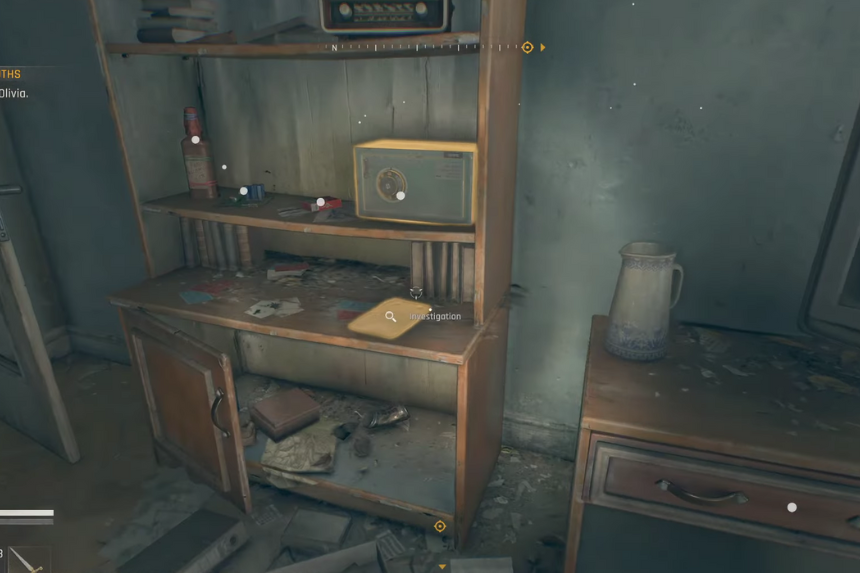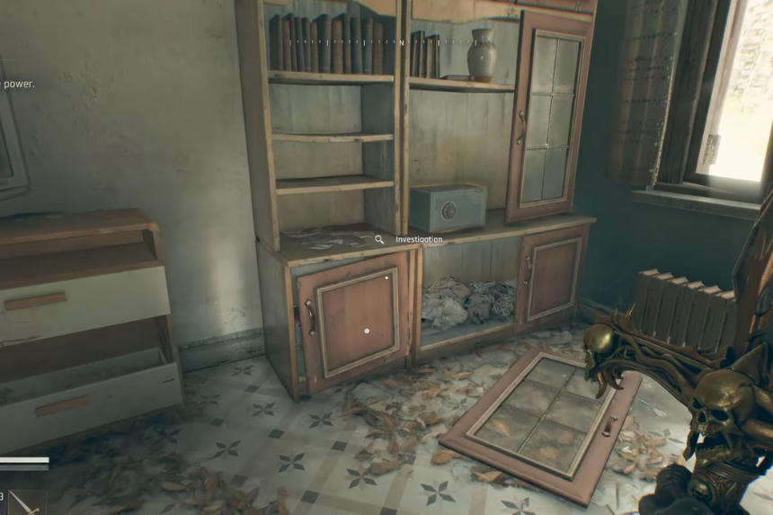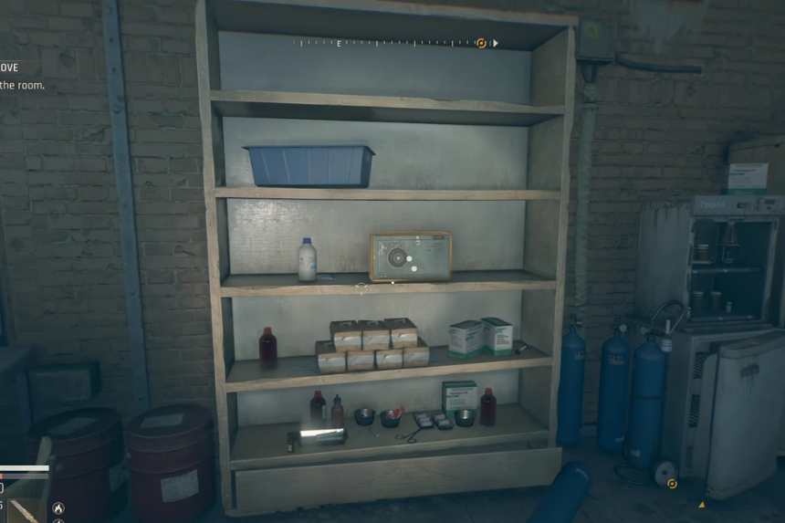 Situated in a random empty apartment. The safe stands on the top floor beside papers that have been spread everywhere and utility equipment.