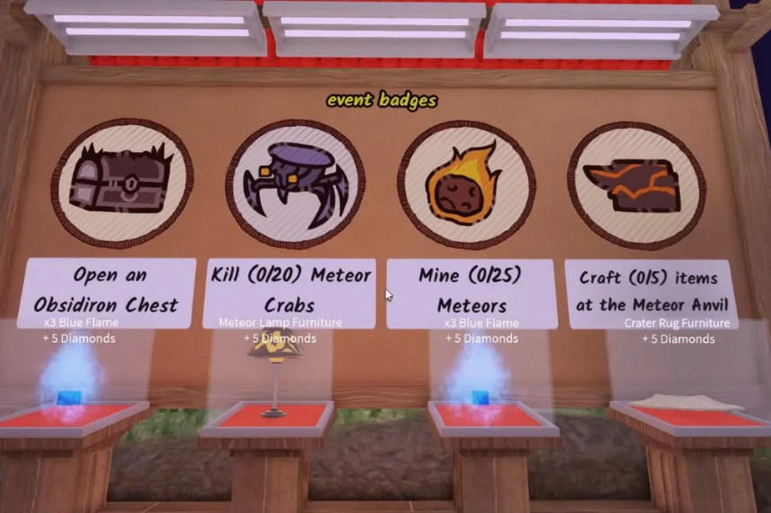 The first badge is tied to the brand-new Obsidiron Chest, a powerful item that can only be obtained through crafting. To unlock it, you’ll need to gather materials such as Meteor Shards, Gold Shards, and Obsidiron Ingots, then use them at the Meteor Anvil.