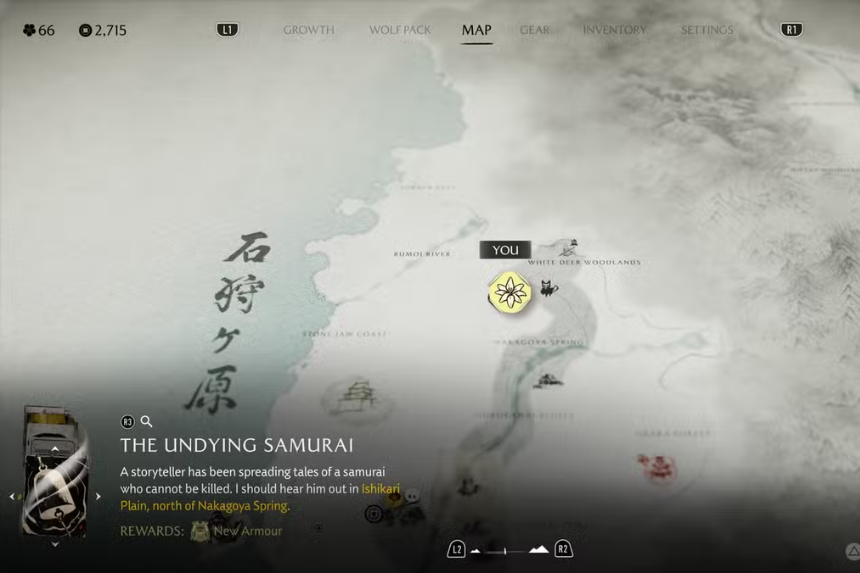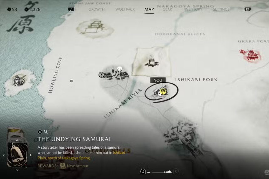 Your journey begins in the Ishikari Plain, northwest part of the map. Go east of Ishikari Market until you reach a ruined village. There is a guy sitting next to a boulder here who tells a rumor of a story-teller with more information about the Undying Samurai. Walking up to him initiates the Mythic Tale.