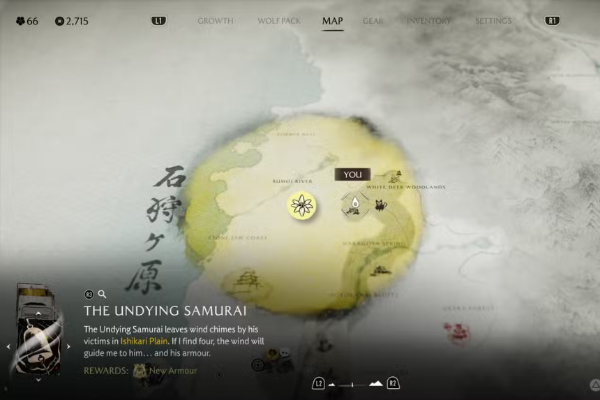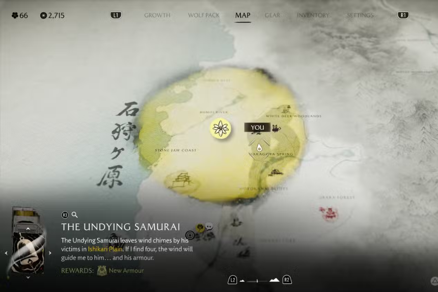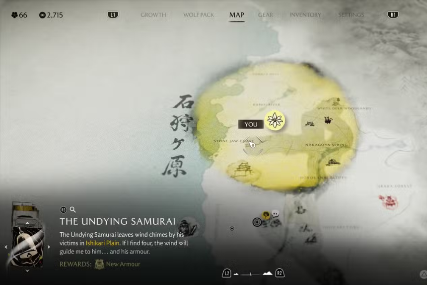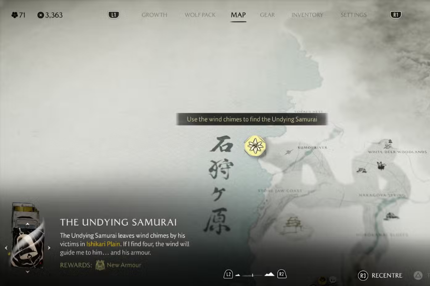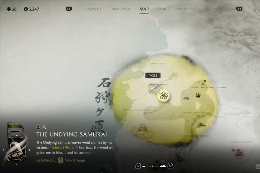 The Undying Samurai’s lair is to be found on the extreme western end of the Ishikari Plain, north of Stone Jaw Coast and west of Rumoi River. Use the Wind Chimes as your map—the more noise and speed they make while chirping, the closer you are.