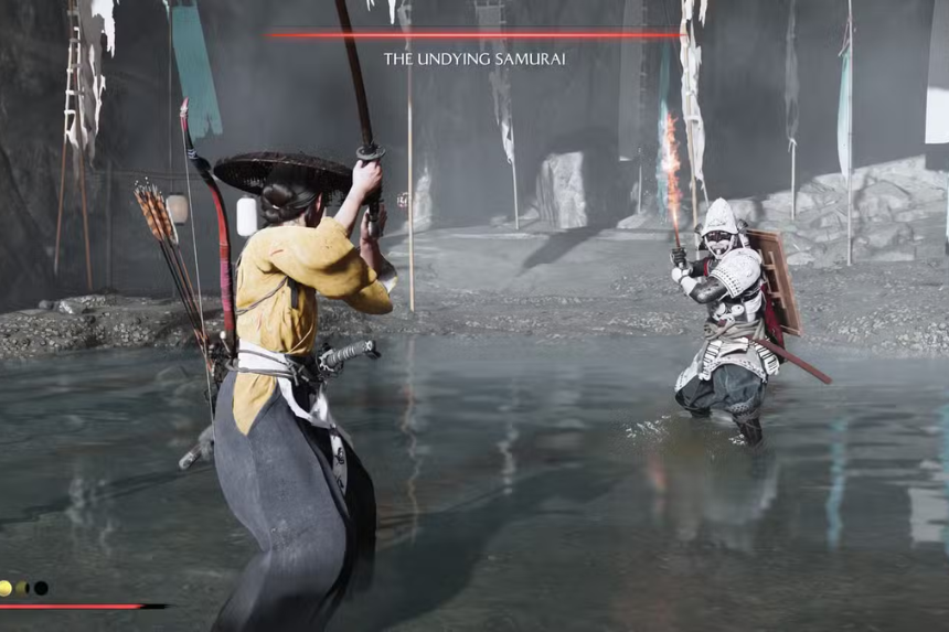 When you arrive at the signposted cliffside, you’ll see scattered armor on sticks marking the entrance. A rope to a tree stump lets you drop down into an underwater cave. Within, put all four Wind Chimes on the wooden posts to call the Undying Samurai and start the boss fight.