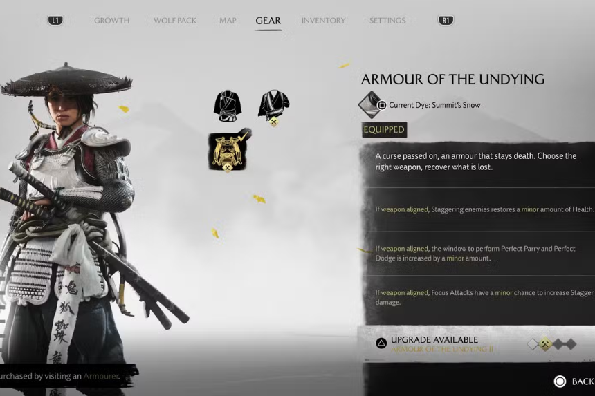 The base is already solid, but improving it at any Armorer in Ezo makes it even more valuable. Not only do each upgrade increase the buffs, but they also transform the look of the armor, providing additional plating and eventually a cape for the more sinister look. More advanced levels widen the health gained from staggers and widen the parry/dodge windows further—perfect for players who rely on sharp timing while in combat.